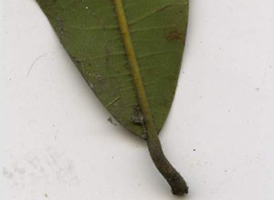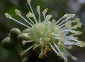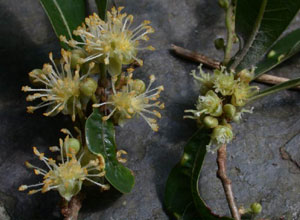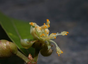 花雌雄異株──也就是說雌花和雄花是生長於不同棵的樹上,花生長的方式為繖形花序,其外有一總苞片,四片成十字對生而內有花四朵,每朵花的花被片有6 片,雄性花有明顯之雄蕊9枚,花絲上長有毛,而花藥分成4室,成熟後外層像往外上翻的窗戶般打開(稱為瓣裂),花藥也跟著拉出來,雌蕊則退化、不明顯;雌花有明顯凸出之花柱,而頂端之柱頭如雪花狀──稱之為「指狀柱頭」,剛長時是如手指般一支支,而後每支再展開,上面有一根根凸起物便於讓花粉著床,雄蕊則退化、不明顯。果為長橢圓形,初時綠色,上有白點成熟後為黃綠色,而果的基部有一如杯子狀的果托,成熟時黑色。
