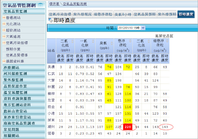 以今日(1/10)下午三時環保署監測的即時濃度數值為例,最接近屏東原住民鄉鎮的潮州測站數據顯示懸浮微粒(PM10)濃度為228 μg/m3高居全台第一,也遠超過標準值125μg/m3;細懸浮微粒(PM2.5)也不遑多讓,濃度為143μg/m3也高居全台第一。(PM2.5尚未列入台灣空氣品質標準管制內,世界衛生組織的細懸浮微粒基準為日平均25μg/m3,年平均10μg/m3。)