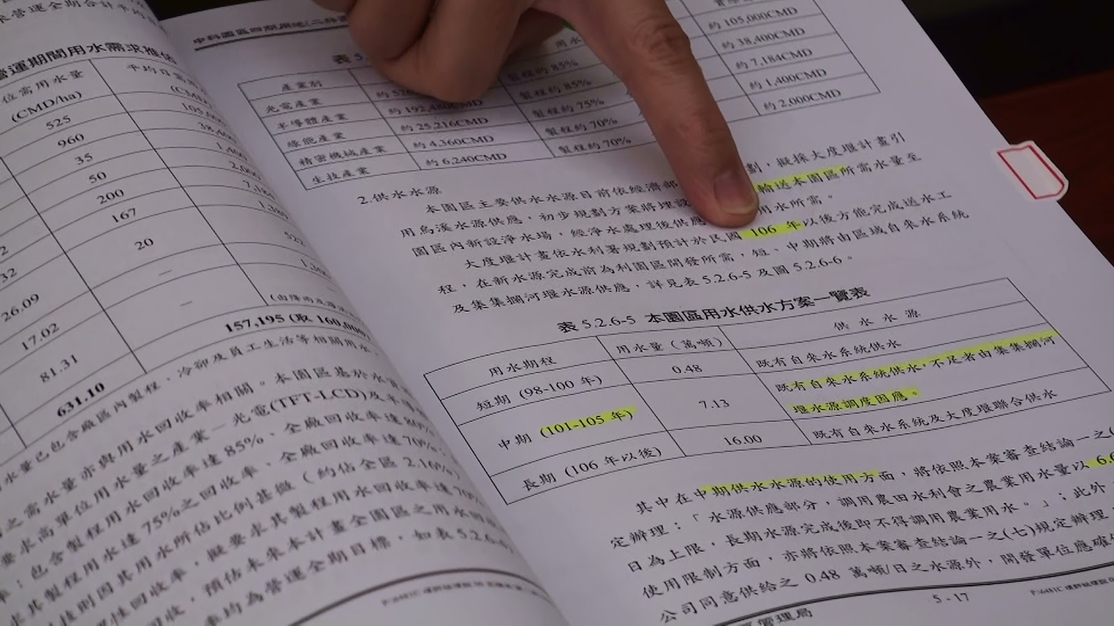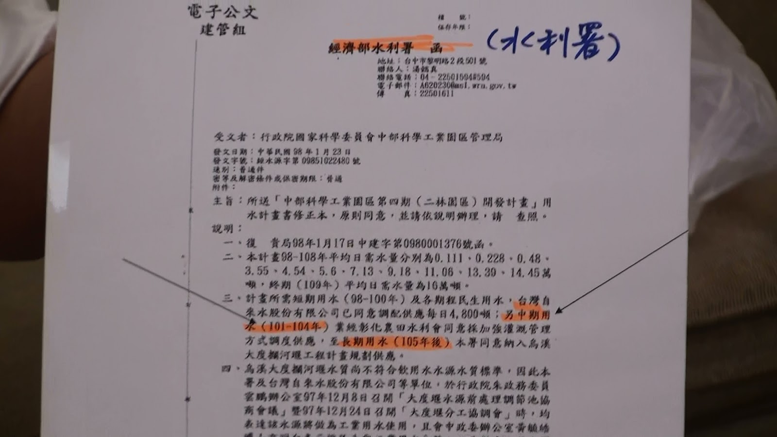 陳椒華指出,98年9月的環評計畫書中的「中期用水」是從「101-104年」,但99年4月的環評定稿本卻被改成「101-105年」。另外,環評計畫書中原本記載:「上述供水方案已納入本案用水計畫書,並經主管機關水利署函同意在案」,但環評定稿本卻將這段文字拿掉。