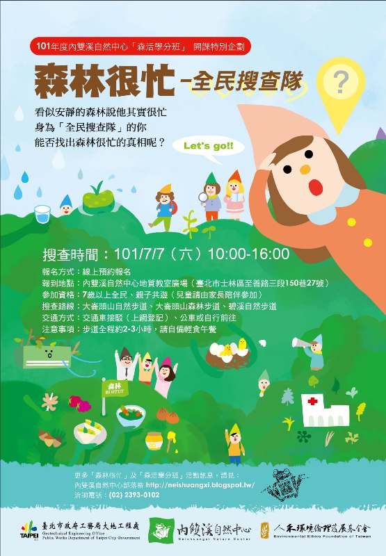 101年度內雙溪自然中心「森活學分班」開課特別企劃「森林很忙-全民搜查隊」邀請全民參與、親子同行,走進都市森林中一同探索森林的多功能服務,解開森林很忙的秘密。當日在森林步道中規劃各種闖關活動,準備好來挑戰了嗎?