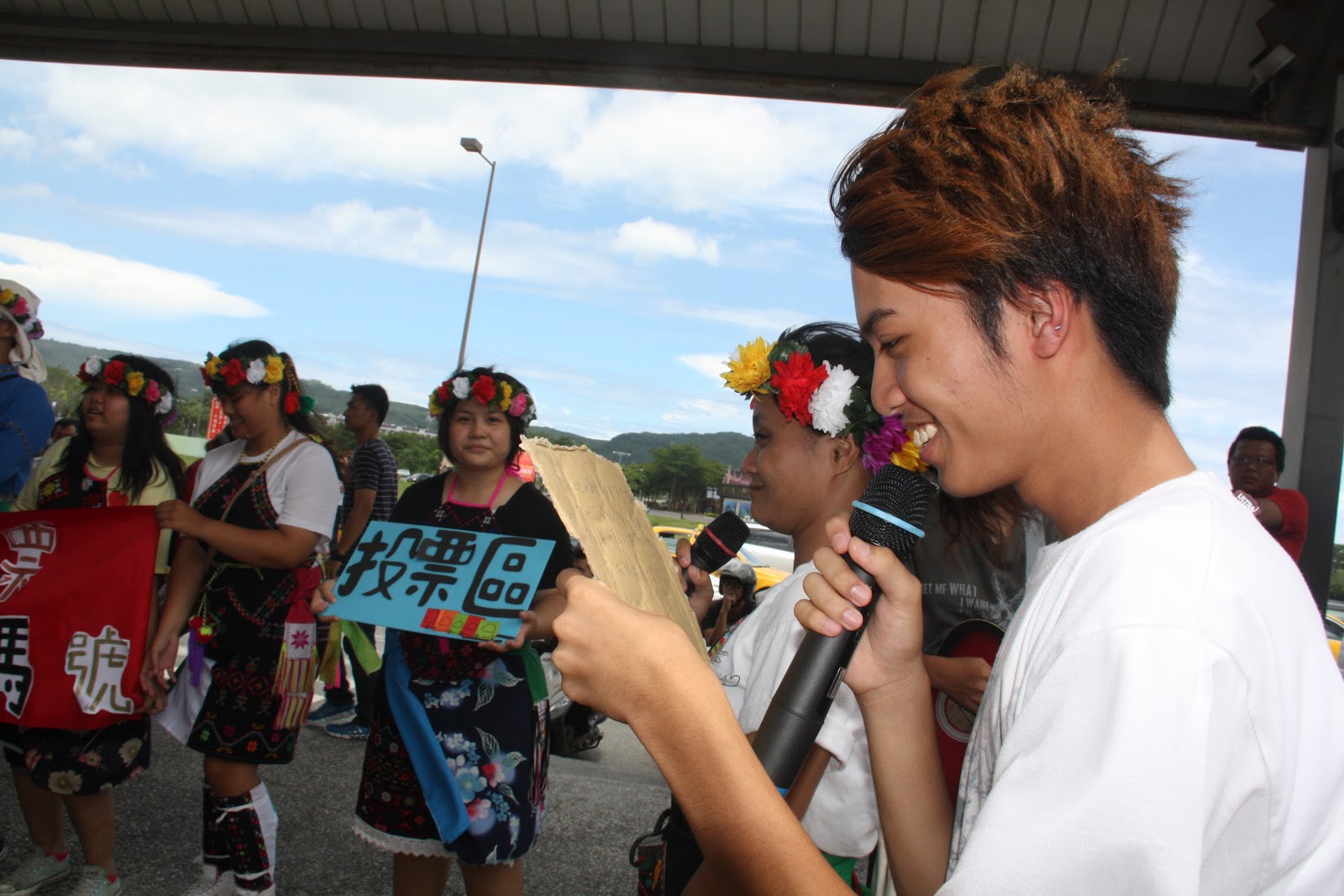 到了7月19日晚間八點多,眼看彼此之間同在3000多票就快追平,普悠瑪的年輕人予文傳來私訊提出一個非常棒的拉票宣傳法。她說,是否趁著隔天7月20日適逢週五往來火車站遊客增多的時間,動員青少年一起穿著傳統服去唱歌拉票,不管是合唱陳建年這首最適合的主題曲「故鄉普悠瑪」、或是把筆電搬到現場連線立即投票、或是尋求觀光客與返鄉遊子留下相關資料代為上網投票的支持,相信可以創造話題性。這主意超好,剛好青少年都在為了準備週末感恩海祭聯歡會的晚會表演節目聚集在福凌家,於是我們就迅速集結,年輕人開始發想口號與製作看板、彈奏吉他的分工,高山舞集的老人家聽聞這場行動也準備在隔日中午前來支持,更有其他部落的年輕人也表示願意到現場支持。就這樣,大家約定週五中午前到火車站就定位,開始了我們一生中只有這麼一次的熱血宣傳經驗。