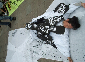 為此,女性環保團體代表特別選在7日母親節前夕,在立法院上演行動劇,由一位年過半百的媽媽身穿白衣,象徵未被破壞的自然環境,但接著被各種象徵破壞力量的污濁染料丟置,再被披上「蘇花高」與四個象徵「水庫造型」的黑色帶子,母親台灣即不堪負荷,身體慢慢倒下、死去,留下一旁隱喻內再良知的小女孩不斷哀嚎、哭泣。