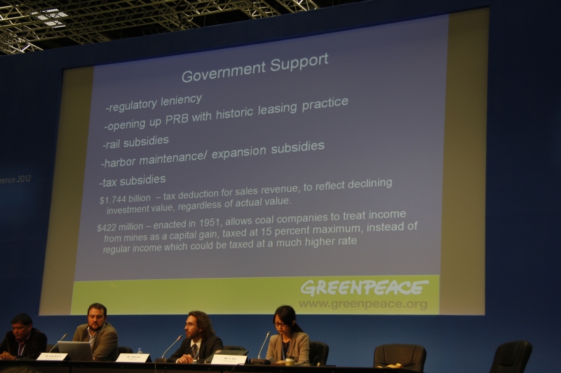 同場週邊會議,中國綠色和平組織的李雁分享了煤炭在中國的環境衝擊。中國是全球煤炭生產最多的國家,占了世界總產量的半數,造成空氣污染、碳排放,並大量竭取水資源,而由於人口眾多,經濟發展快速,能源需求極大,目前竟要自外國進口煤炭。國際能源總署統計數據顯示,2010年全球煤炭貿易量上升13.4%(1083百萬噸),反映了中國與印度需求增加,而澳洲與美國煤炭出口持續飆升的現象。