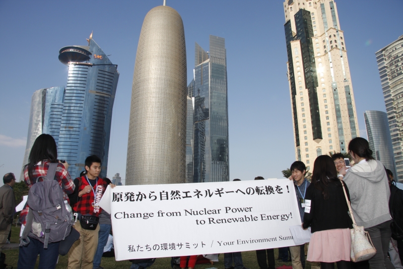 日本學生團體「私たちの環境サミット」去年也有參加COP,我跟他們討論著日本核電為何能夠重啟的政治氛圍,紅衣小子忿忿不平的說著兩個關鍵點,電力公司可以賺錢,以及日本民眾不希望社會變動的太急躁。