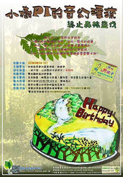 有雙流這片森林,才有雙流自然教育中心。中心於今年七月滿四歲了!這次活動特別結合「生日慶」與「樹」二大主題,樹木和人一樣有生老病死的生命歷程,每位PI需完成多重關卡經歷種子發芽、茁壯、開花和結果,然而「樹」生如同人生般無法事事順利,可能遇到山老鼠無情的砍伐與盜挖,各位PI們運用你們的聰明智慧通過重重關卡,和自然教育中心一起成長吧!