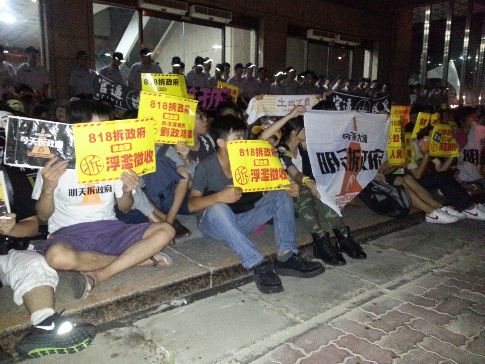 8月18日苗栗縣政府強拆大埔四戶滿一個月,由於行政院並未回應農村陣線「道歉賠償、立即修法」等四項訴求,昨(18日)農村陣線在凱道發起「818拆政府行動」,警方統計超過2萬人到場。晚間9點30分活動結束後宣布前進行政院,但人潮走到徐州路聯合辦公大樓時突然右轉並翻過欄杆搶入,快速分散坐在中央大樓四周,大樓廣場坐滿人潮直到入夜。