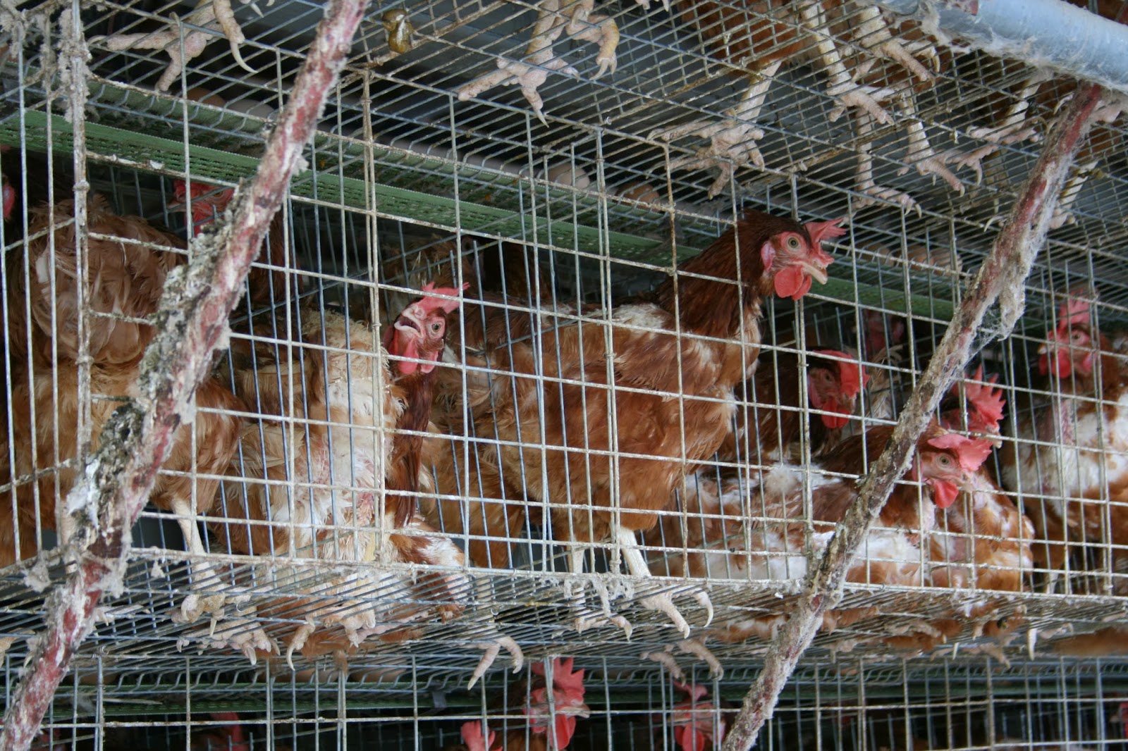 在約A4紙張大小的籠子裡關了2~4隻雞,窄小空間導致牠們互相踩踏,多數雞一輩子不曾走踏地面,更無法張開翅膀梳理羽翼。