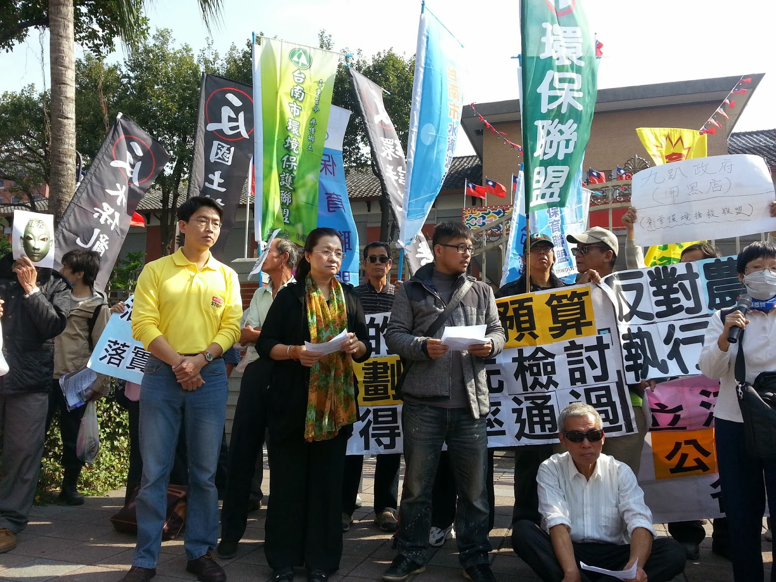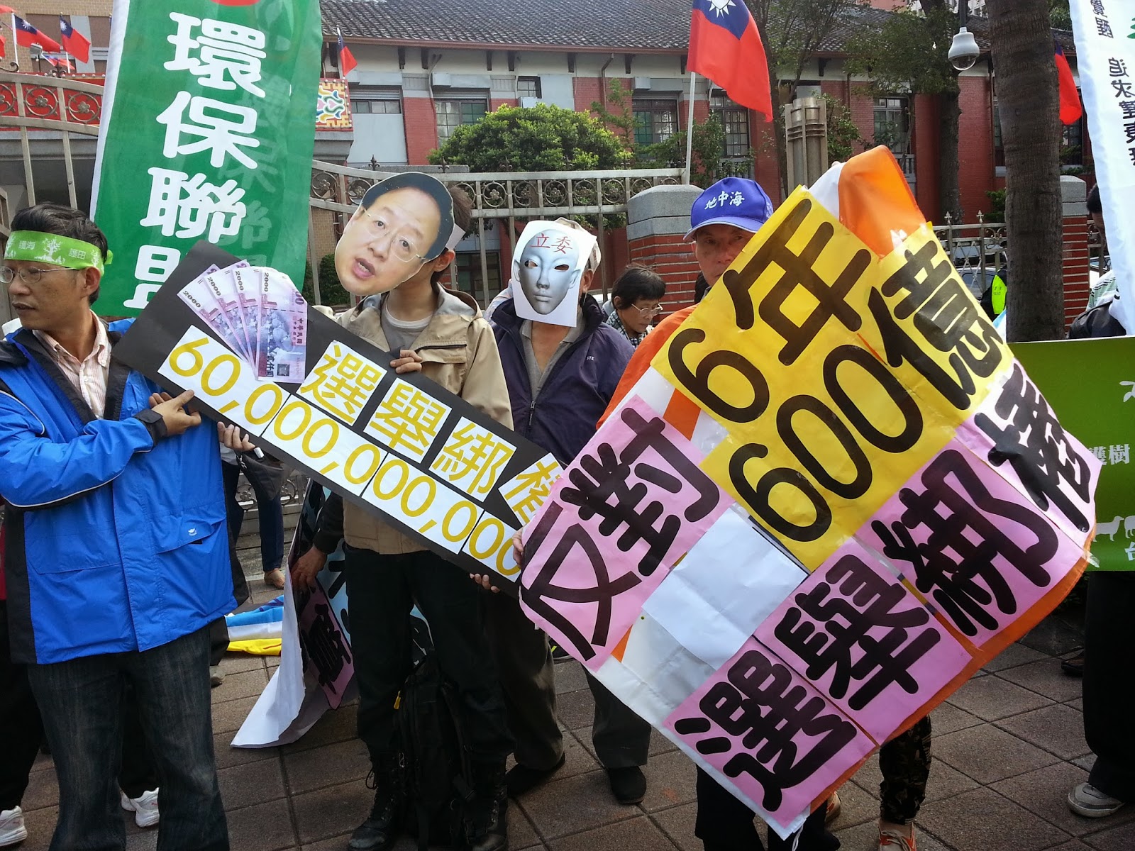 「水患治理沒半步、選舉綁樁最在行、反對六年600億、政府隨便亂花錢」。10多個環保團體20日到行政院、立法院抗議過去8年1160億「易淹水地區水患治理計畫」執行完後,未提出完整報告前,14日再通過以特別預算編列6年600億「綜合治理特別條例」。
