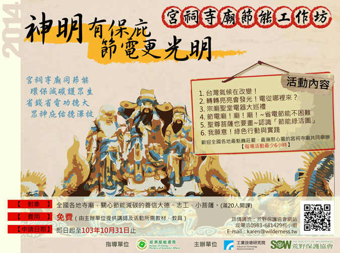 2014年荒野邀請宗教廟宇發揮正信教化的力量,共同舉辦節能推廣活動,帶領信眾從日常生活的習慣改變、建立良好的節能措施,在「六大節能手法」的運用下,讓光明燈引領信眾前途光明,也讓台灣的環境越來越光明!