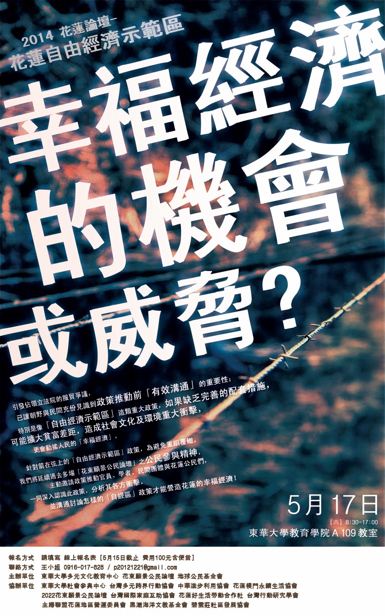 引發佔領立法院的服貿爭議,已讓朝野與民間充份見識到政策推動前「有效溝通」的重要性;特別是像「自由經濟示範區」這類重大政策,如果缺乏完善的配套措施,可能擴大貧富差距,造成社會文化及環境重大衝擊,更會動搖人民的「幸福經濟」。針對箭在弦上的「自由經濟示範區」政策,為避免重蹈覆轍,我們將延續過去多場「花東願景公民論壇」之公民參與精神,主動邀請政策推動官員、學者、民間團體與花蓮公民們,一同深入認識此政策,分析其各方衝擊,並溝通討論怎樣的「自經區」政策才能營造花蓮的幸福經濟!