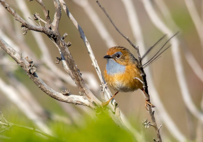 南方鶓鷯鶯(Stipiturus malachurus)棲息在澳洲南部海岸地區,是非常小的鳥,跟火柴盒差不多大,約6公分長,7公克重。背部灰褐色的羽毛帶有黑色條紋,肚子是暖暖的黃褐色,雄鳥的上胸、喉部、眼睛周圍還有一抹獨特的天藍色。