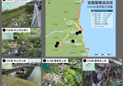 荒野保護協會首度前進宜蘭蘭陽溪流域,公布今(2025)年河川廢棄物快篩調查結果。調查發現,有八成垃圾集中於兩成河段,冬山河出海口、羅東溪上游等幾處為垃圾熱點。
