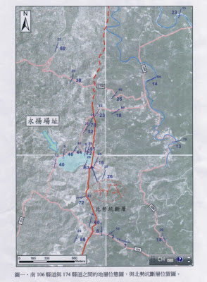 圖中紅線為北勢坑斷層,通過永揚場址右側(中間藍色地區)